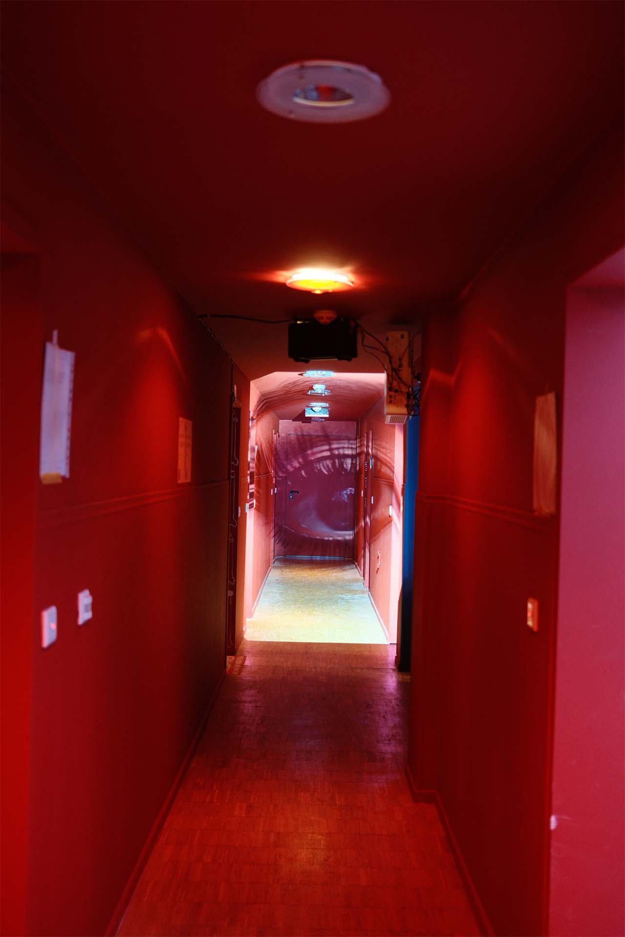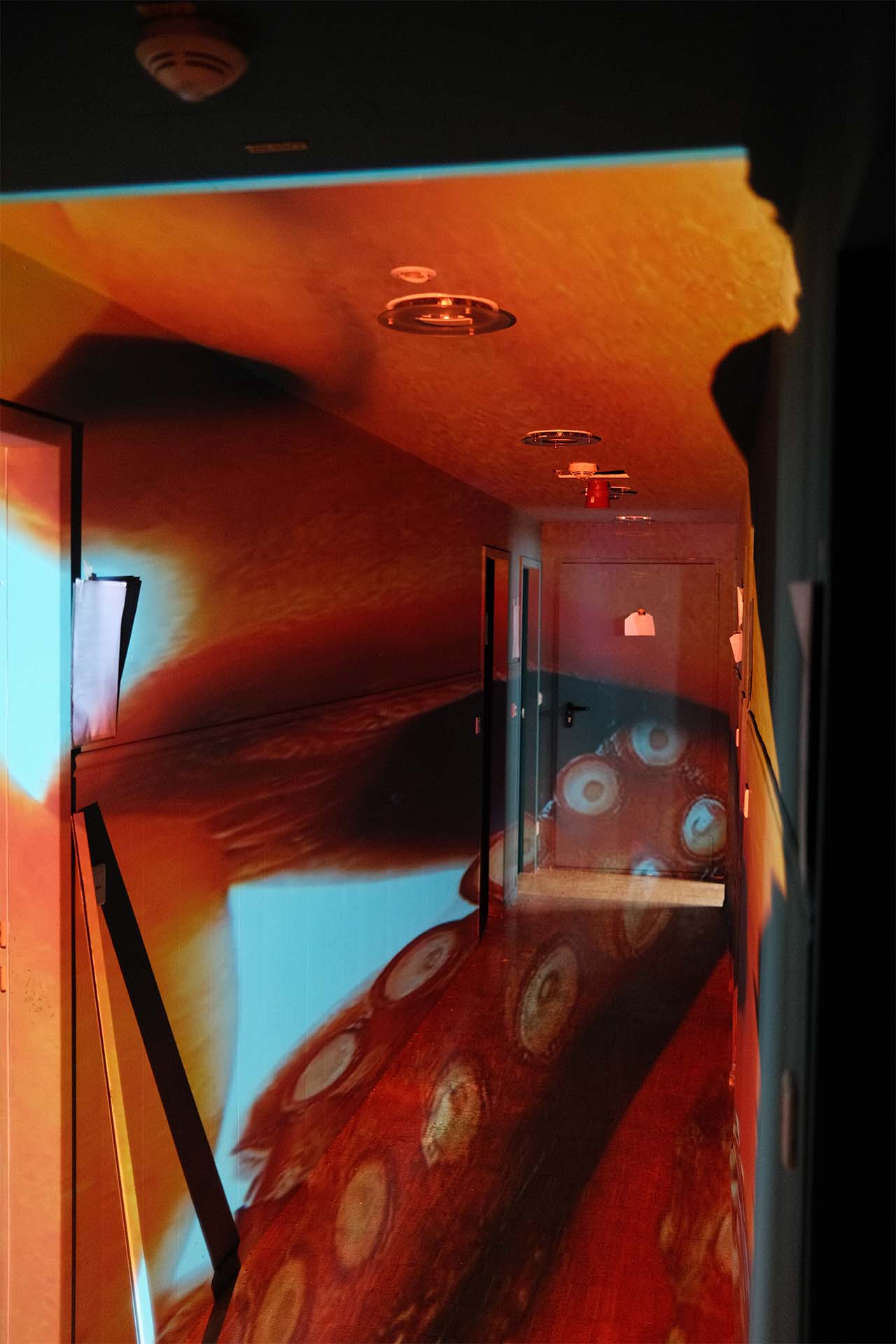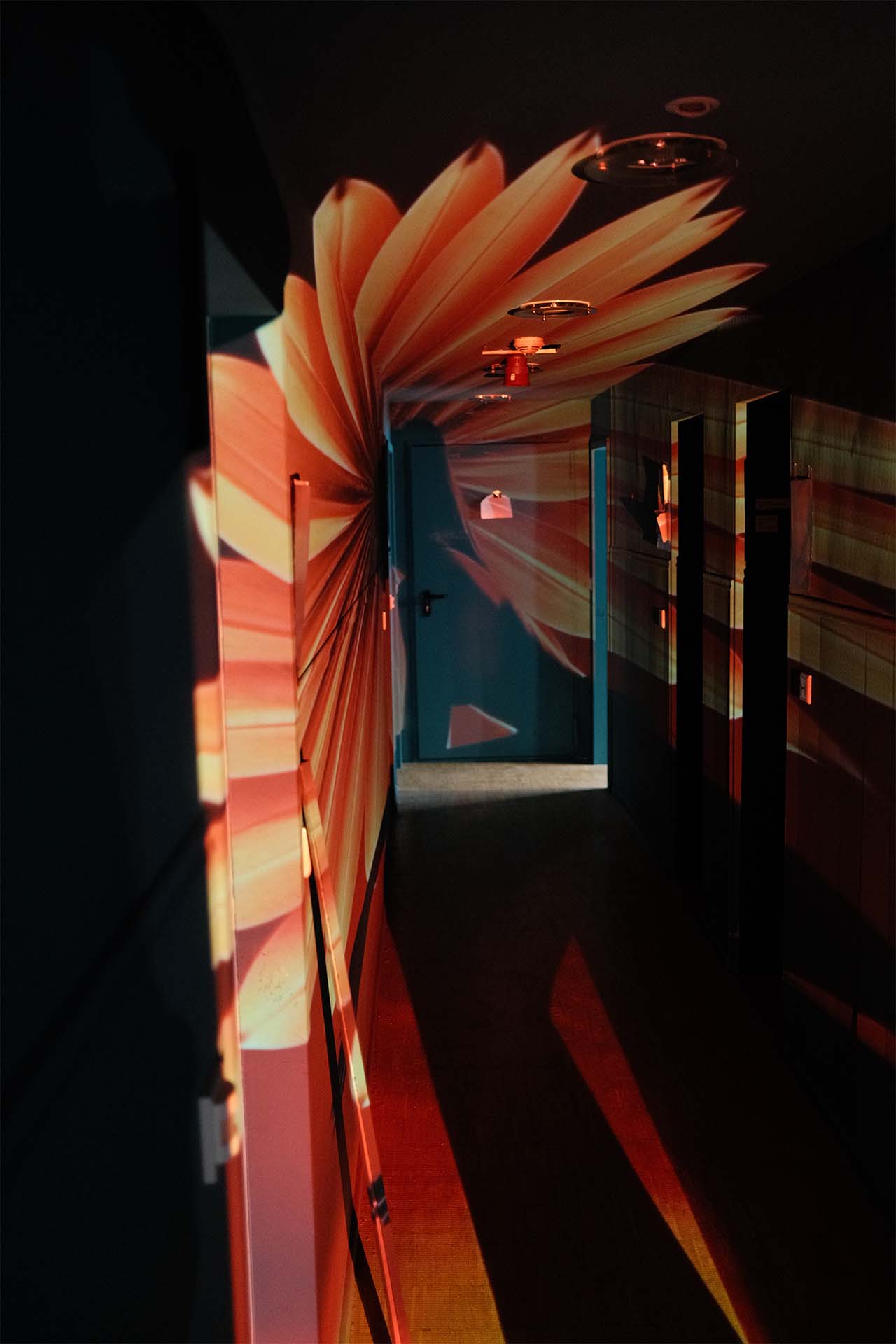 Created for the interim use of the Happy End Hotel in December 2024 (organized by broke.today), we developed a site-specific video installation spanning three floors. The hallways were thematically divided into Love, War, and Happy End. Utilizing a 25-meter projection into the depth of the hotel corridors, we worked with targeted anamorphosis: upon entering the floor, the image initially appeared completely flat and static—a visual barrier that only dissolved into its perspectival distortion as the viewer physically moved into the space.