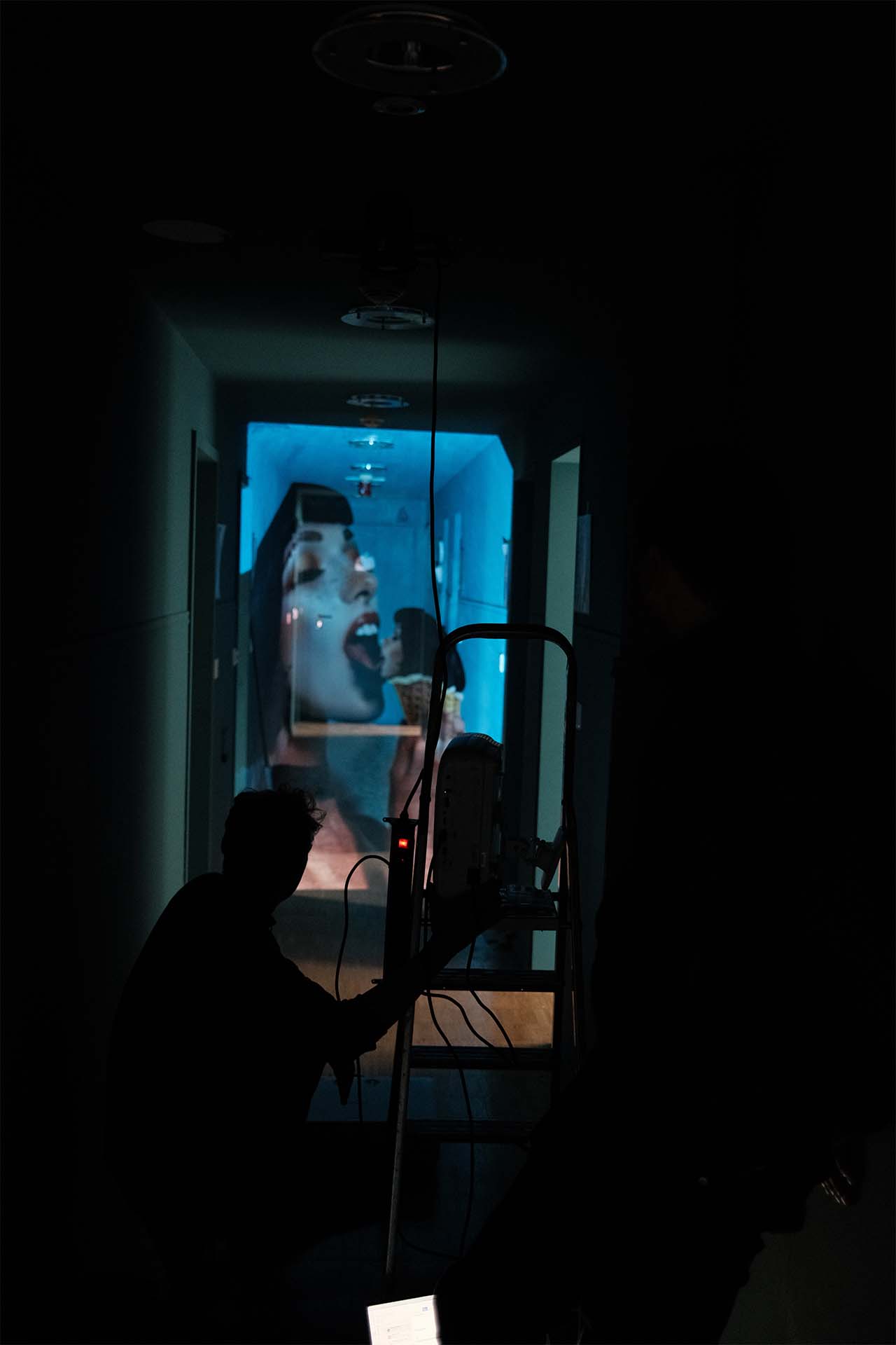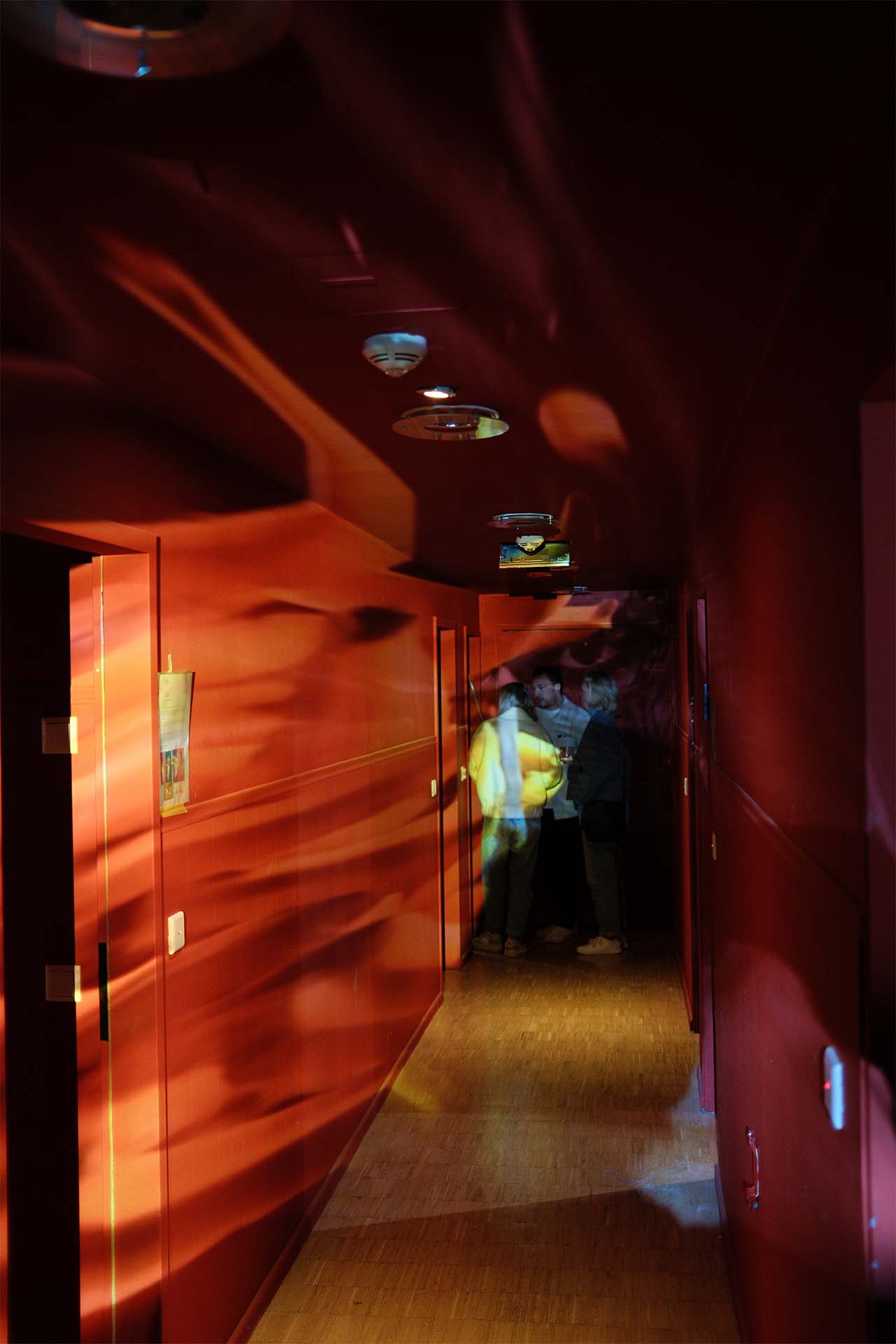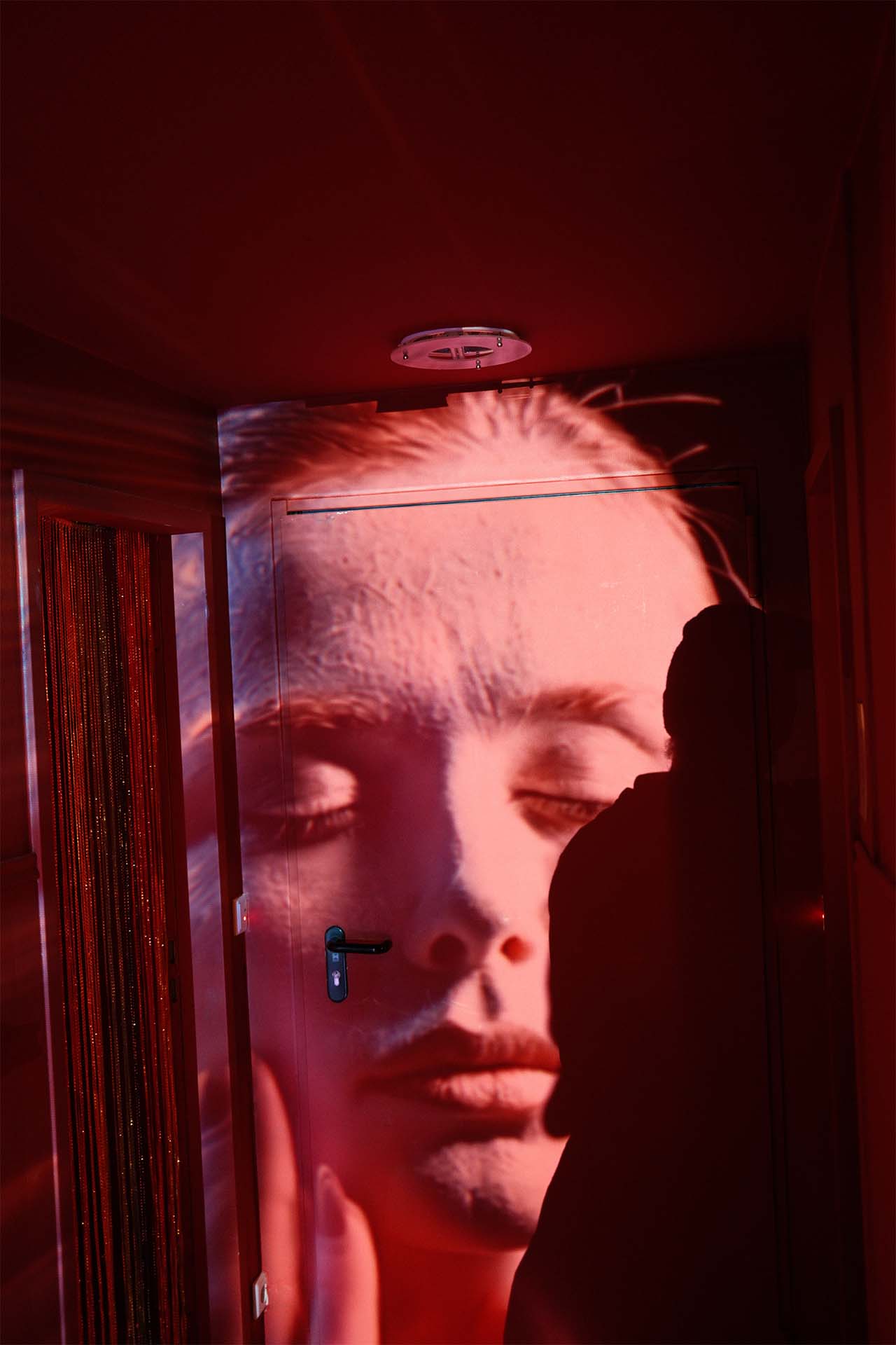 Created for the interim use of the Happy End Hotel in December 2024 (organized by broke.today), we developed a site-specific video installation spanning three floors. The hallways were thematically divided into Love, War, and Happy End. Utilizing a 25-meter projection into the depth of the hotel corridors, we worked with targeted anamorphosis: upon entering the floor, the image initially appeared completely flat and static—a visual barrier that only dissolved into its perspectival distortion as the viewer physically moved into the space.