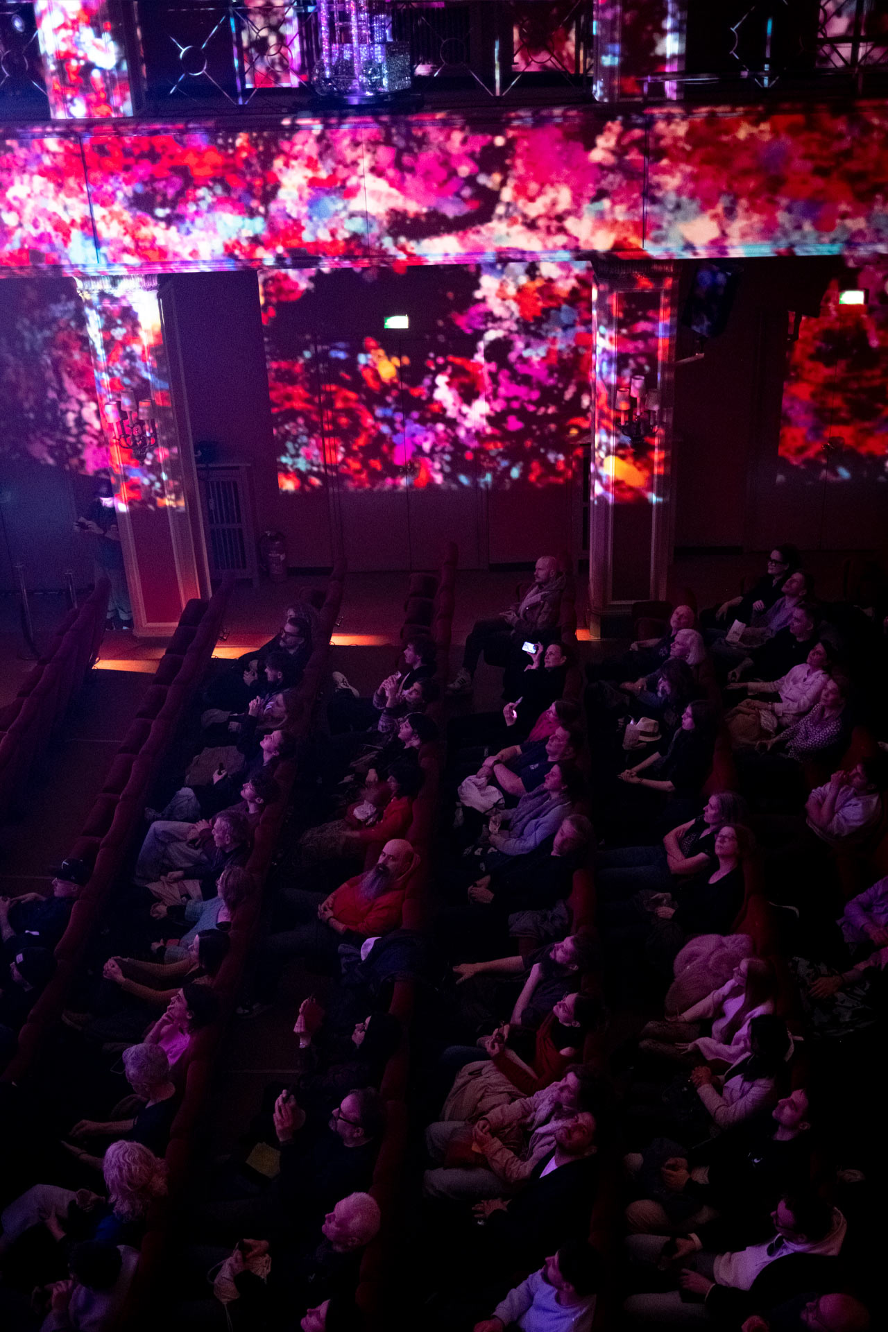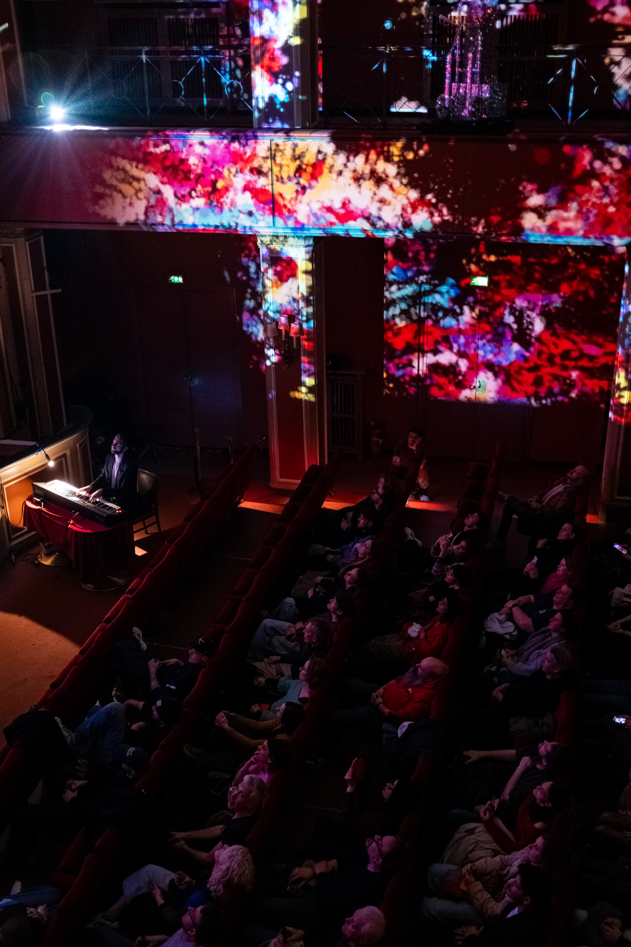 Phase 02 (Sendlinger Tor Cinema): Scaled to a 4-projector mapping setup, the system translated a live pianist’s performance onto the cinema’s historic walls and ceiling, turning the entire architecture into a visual extension of the instrument.